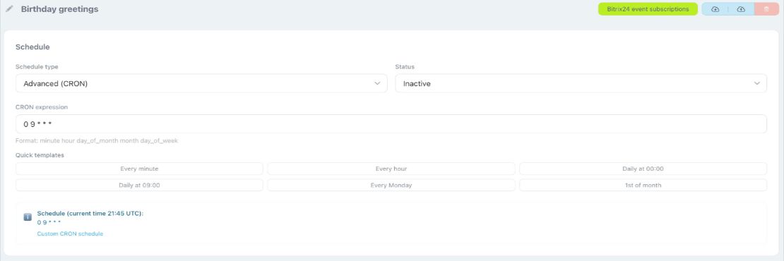 • Advanced (CRON): runs are defined with a CRON expression (five fields: minute, hour, day of month, month, day of week; the format is explained under the field). Quick templates are available — buttons like “Every minute”, “Daily at 09:00”, etc., that insert a ready-made expression.