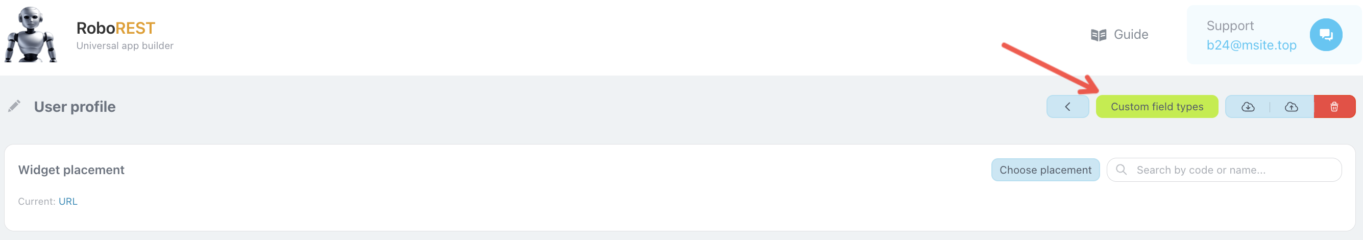 🟢 On the widget page, click Custom field types to open the custom field type registration screen.