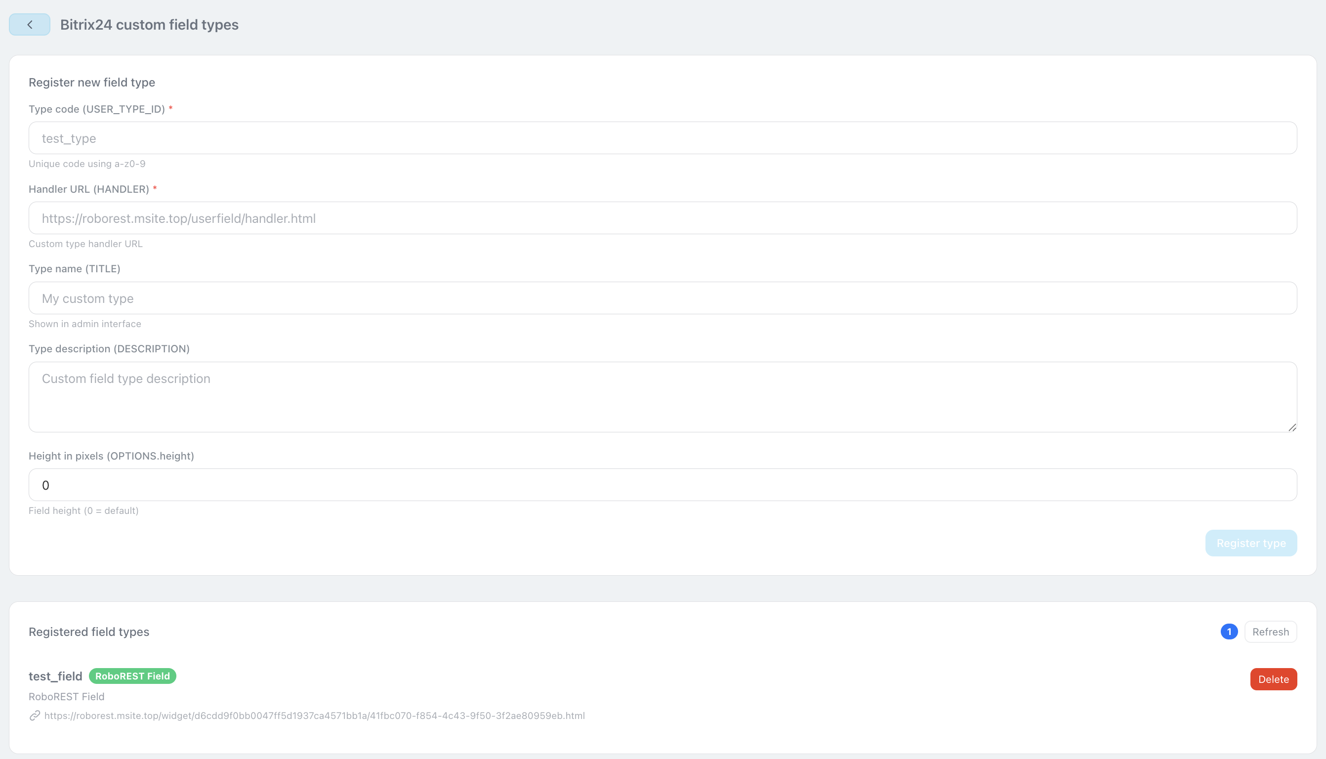 🧭 Beyond widget placements, RoboREST lets you register custom user field types for Bitrix24. After registration, the type appears in CRM like any other field type when you add a field — for example on a deal card. You can build dependent fields (one choice drives another list), button panels that run actions such as starting business processes, and other custom UI inside the card.